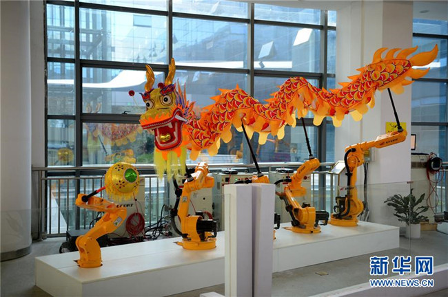 這是10月21日在蕪湖機器人產(chǎn)業(yè)園拍攝的舞龍機器人。 新華社發(fā)(黃博涵攝)