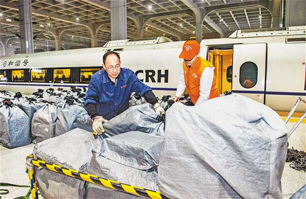 11月12日晚,重慶西站,工作人員正在卸載G8595次列車上的快件。為應(yīng)對“雙11”帶來的巨量物流,重慶鐵路部門利用高鐵動(dòng)車組、旅客列車行李車等運(yùn)力資源,提供物流服務(wù)。記者龍帆攝