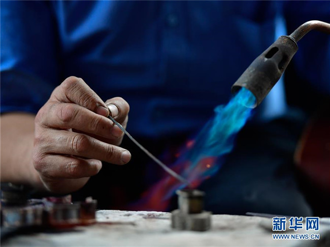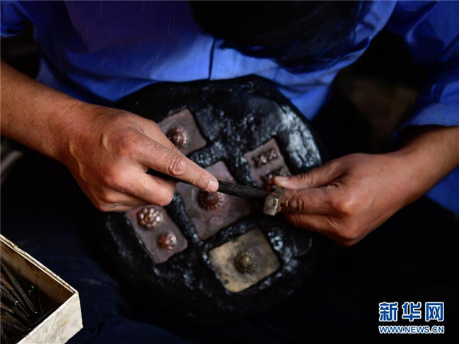 11月17日,芒擦藏刀匠人更求彭措在制作藏刀裝飾品。新華社記者 張龍 攝
