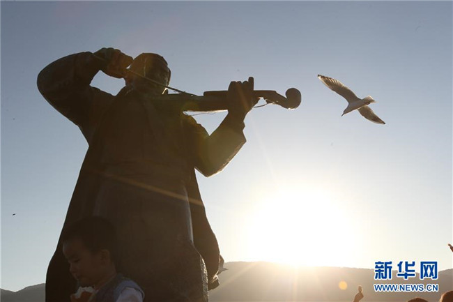 11月16日,一只紅嘴鷗飛過滇池岸邊的聶耳雕塑。 新華社記者 金林鵬 攝