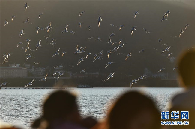 11月16日,游客在滇池觀賞紅嘴鷗。 新華社記者 李芒茫 攝