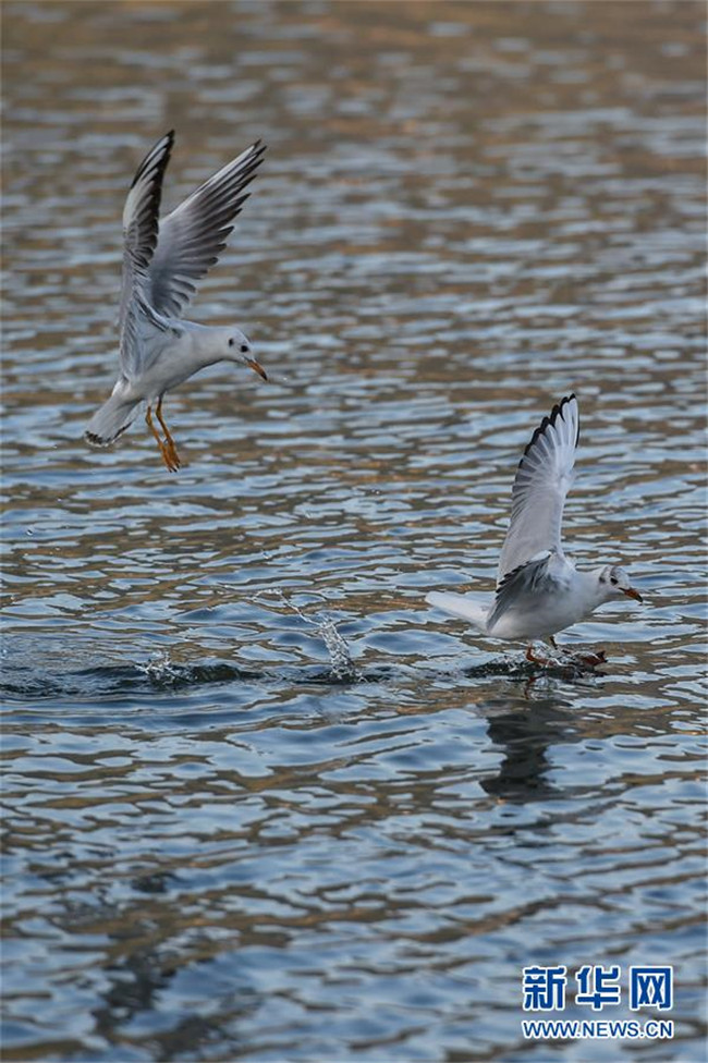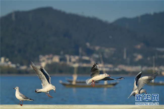 11月17日,紅嘴鷗在滇池嬉戲。 新華社記者 李芒茫 攝