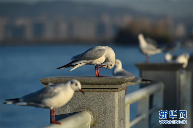 11月17日,紅嘴鷗在滇池附近棲息。 新華社記者 金林鵬 攝