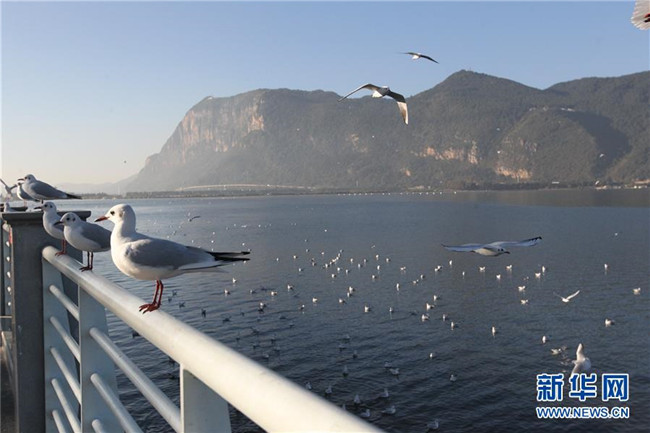 11月17日,紅嘴鷗在滇池棲息。新華社記者 李芒茫 攝