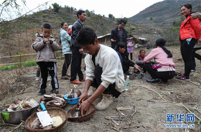 11月24日,在昭覺縣支爾莫鄉(xiāng)阿土列爾村,當(dāng)?shù)鼐用駵?zhǔn)備熟食、酒等食物祭祖,并相互贈(zèng)送。