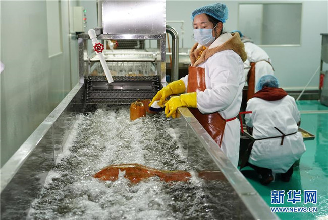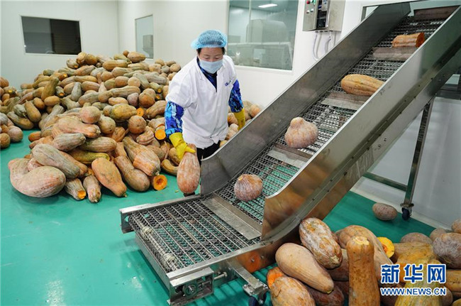 12月3日,工人在漢濱區(qū)五里工業(yè)集中區(qū)一家南瓜加工企業(yè)的生產(chǎn)線上清洗南瓜。新華社記者 邵瑞 攝