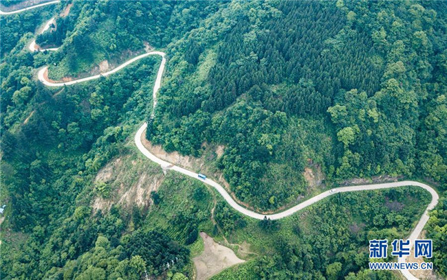 “通村村”車輛行駛在貴州省雷山縣大塘鎮(zhèn)的鄉(xiāng)村公路上(5月24日無人機拍攝)。 新華社記者 陶亮 攝