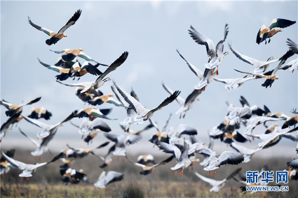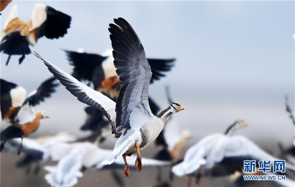 12月11日在貴州草海保護區(qū)拍攝的越冬的斑頭雁和赤麻鴨。新華社記者楊文斌攝