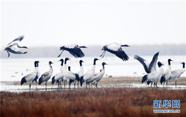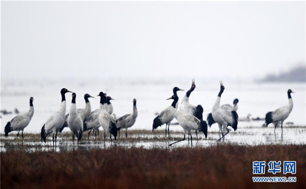 12月11日在貴州草海保護區(qū)拍攝的黑頸鶴。新華社記者楊文斌攝