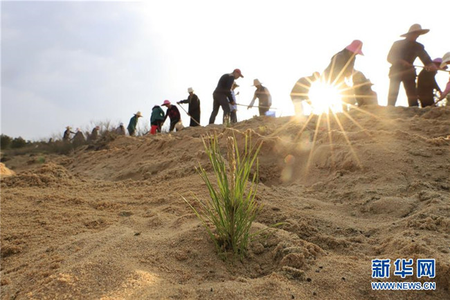江西廬山市蓼南鄉(xiāng)組織村民在長(zhǎng)江流域鄱陽(yáng)湖畔的沙洲上種植瞿麥。瞿麥?zhǔn)且晃吨兴幉?,不僅有固沙綠化作用,還具有較高的經(jīng)濟(jì)價(jià)值(4月12日攝)。新華社發(fā)(韓俊烜 攝)