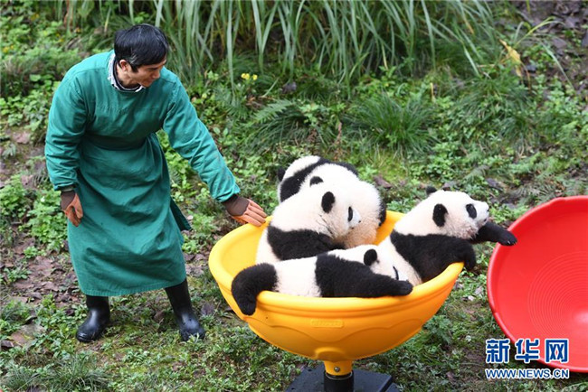 12月22日,飼養(yǎng)員引導大熊貓寶寶到戶外運動。當日,重慶動物園為4只大熊貓寶寶“雙雙”“重重”“喜喜”“慶慶”舉行半歲生日慶祝活動。4只半歲大熊貓在飼養(yǎng)員的照料下,在熊貓館運動場內(nèi)玩耍、嬉戲,與市民游客一同過冬至。新華社記者唐奕攝