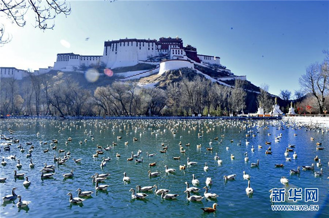 冬日,西藏拉薩市布達(dá)拉宮腳下的龍王潭公園成了鳥的“天堂”。數(shù)不盡的斑頭雁、赤麻鴨、紅嘴鷗在這里嬉戲、覓食。