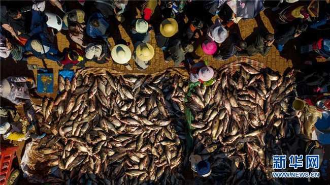 12月25日,在星云湖畔的老河咀魚市,漁民將捕撈到的魚搬運(yùn)上岸。新華社記者 胡超 攝