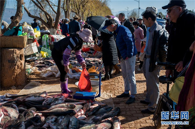 12月25日,人們?cè)谛窃坪系睦虾泳佐~市選購(gòu)剛捕撈的鮮魚。新華社記者 胡超 攝