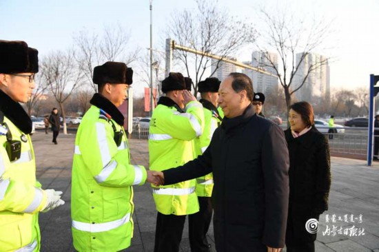 1月24日,自治區(qū)黨委書記、人大常委會主任石泰峰,自治區(qū)黨委副書記、自治區(qū)主席布小林在呼和浩特看望慰問春節(jié)期間堅守一線崗位的執(zhí)勤交警。 內蒙古日報社融媒體記者 袁永紅 攝