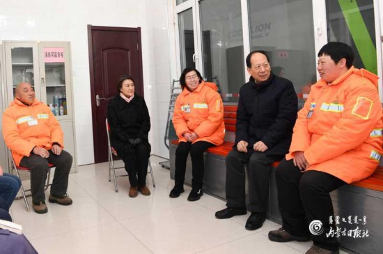 每逢節(jié)慶假日,往往是環(huán)衛(wèi)工人最忙最累的時候。石泰峰、布小林惦記著這些非常辛苦的勞動者,來到賽罕區(qū)環(huán)衛(wèi)局管理八所,向他們祝賀新年。在環(huán)衛(wèi)工人休息室,石泰峰、布小林與大家圍坐在一起親切交談,了解春節(jié)期間值班安排情況,仔細察看休息室及相關保障情況。石泰峰深情地說,環(huán)衛(wèi)工人是城市的“美容師”,你們一人勞累,換來萬人清潔,沒有你們的辛勤工作,就沒有城市環(huán)境的清潔美麗,也就沒有市民生活的安逸舒適,謝謝你們,給你們拜年了。
