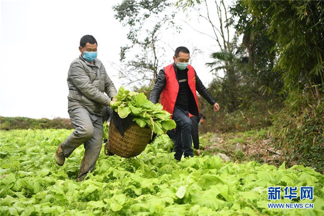 2月8日,菜農(nóng)(左)和鄉(xiāng)村蔬菜配送小隊志愿者在地里采收蔬菜。新華社記者 唐奕 攝