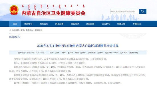 2月12日,記者從內(nèi)蒙古自治區(qū)衛(wèi)生健康委員會(huì)獲悉,2020年2月11日9時(shí)至12日9時(shí),內(nèi)蒙古自治區(qū)報(bào)告新增新冠肺炎確診病例2例。無新增疑似病例。