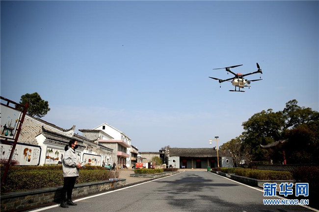 在江西省吉安市峽江縣馬埠鎮(zhèn)上蓋村,農(nóng)機(jī)合作社飛手操作無(wú)人機(jī)進(jìn)行消殺作業(yè)(2月1日攝)。 新華社發(fā)(陳福平 攝)