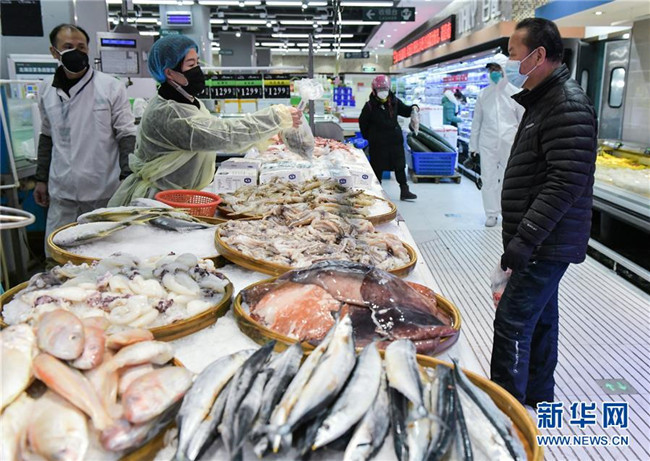 2月10日,顧客在湖北省武漢市江漢區(qū)中百倉(cāng)儲(chǔ)超市北湖購(gòu)物廣場(chǎng)店選購(gòu)水產(chǎn)。新華社記者 李賀 攝