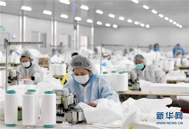 在位于湖北省仙桃市的湖北裕民防護(hù)用品有限公司生產(chǎn)車間內(nèi),工人們加緊生產(chǎn)醫(yī)用防護(hù)用品(1月28日攝)。新華社記者 李賀 攝