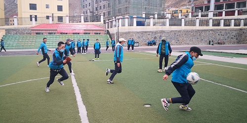 玉樹(shù)州民族中學(xué)學(xué)生在操場(chǎng)踢足球。 楊陽(yáng)攝