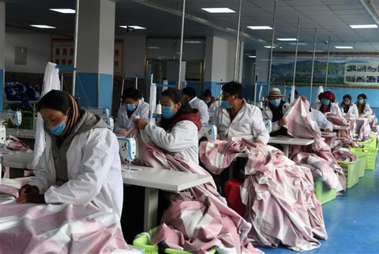 丁青縣農(nóng)牧民群眾在縣職教中心扶貧車間參加裁縫培訓(xùn)。記者洛桑攝