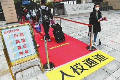 4月23日,成都高新實(shí)驗(yàn)中學(xué)住校的高三學(xué)生像往常一樣,戴著口罩從寢室前往教室。他們按照間隔一米的要求,有序排隊(duì)依次接受額溫槍監(jiān)測(cè)。體溫監(jiān)測(cè)正常的學(xué)生分班、分線路進(jìn)入教室,體溫異常的學(xué)生再次經(jīng)紅外熱成像儀監(jiān)測(cè),如體溫正常,仍按照指定路線進(jìn)入教室,如體溫異常則在學(xué)校保健老師的帶領(lǐng)下,進(jìn)入校門(mén)口旁邊的留觀室進(jìn)行觀察,在保健老師和校醫(yī)的指導(dǎo)下根據(jù)實(shí)際情況就醫(yī)做詳細(xì)檢查。