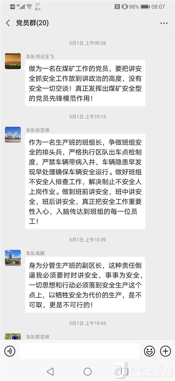 活動(dòng)期間,支部20名黨員認(rèn)真學(xué)習(xí)貫徹集團(tuán)公司、陜北礦業(yè)公司和公司近期安全生產(chǎn)文件材料宣貫落實(shí)精神,深刻吸取安全生產(chǎn)事故教訓(xùn),圍繞“守住安全生產(chǎn)這一‘生命線’,牢固確立‘四個(gè)最’的意識(shí)”工作目標(biāo),展開了圍繞分管業(yè)務(wù)、自身崗位特點(diǎn)的討論學(xué)習(xí)。此次主題黨日活動(dòng),支部黨員紛紛談體會(huì)、講心得,結(jié)合工作中遇到的經(jīng)典案例,剖析了自身工作存在的短板和不足,并提出了具體的改進(jìn)措施。同時(shí),表示在今后工作中將充分發(fā)揮黨員的先鋒模范作用,擔(dān)當(dāng)作為、履職盡責(zé),做到帶頭反三違、帶頭降三違、身邊無(wú)三違。