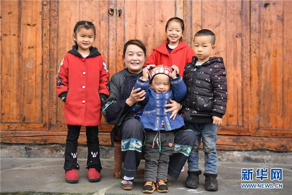 這是4月24日拍攝的吳美金(左二)和她孫子孫女的合影。1967年出生的吳美金,1992年嫁入飛蟲村(現(xiàn)十八洞村飛蟲寨)時(shí),只有爛泥路的飛蟲村不僅田土少,掙錢活路也少,生活十分困難。2014年,吳美金加入了十八洞村苗繡特產(chǎn)農(nóng)民專業(yè)合作社,從小就會(huì)的苗繡傳統(tǒng)手藝如今成了家庭增收的法寶,不僅在家門口就把錢掙了,同時(shí)還能照顧年幼的孫子孫女。“現(xiàn)在的日子,比年輕的時(shí)候好多了。”吳美金說。新華社記者薛宇舸攝