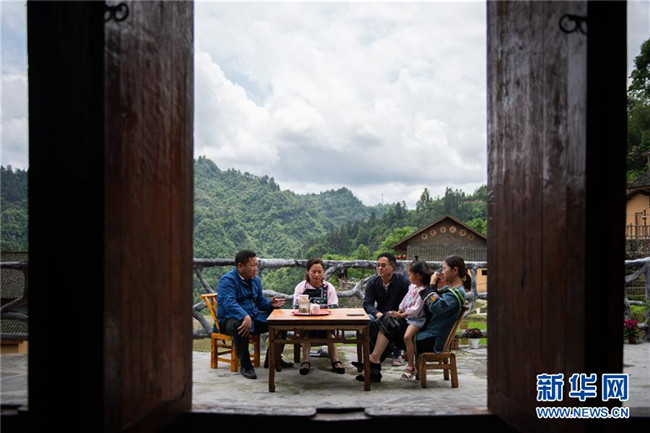5月15日,在湘西十八洞村,麻輝煌(左)在村民楊慧英家了解民宿建設情況。新華社發(fā)(陳思汗攝)
