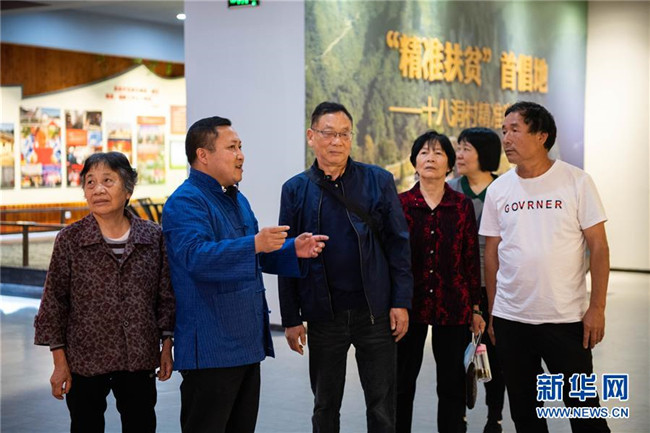 5月15日,在湘西十八洞村精準扶貧展示廳,麻輝煌(左二)向游客講解村史。新華社發(fā)(陳思汗攝)