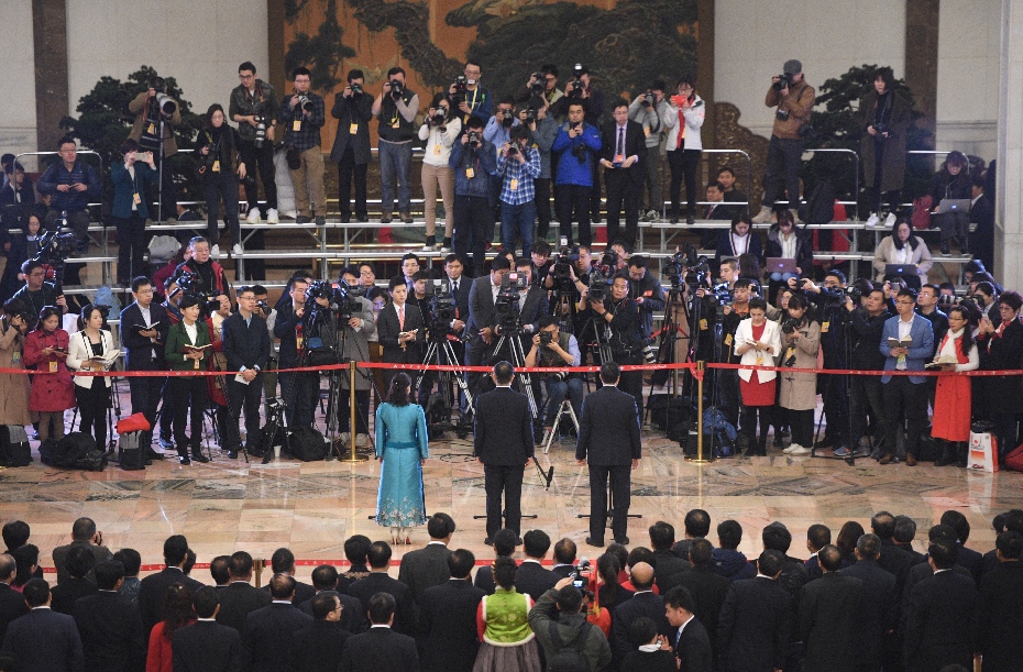 2018年3月20日,十三屆全國人大一次會議在北京人民大會堂舉行閉幕會。這次全國兩會首設“代表通道”,圖為記者在“代表通道”采訪。