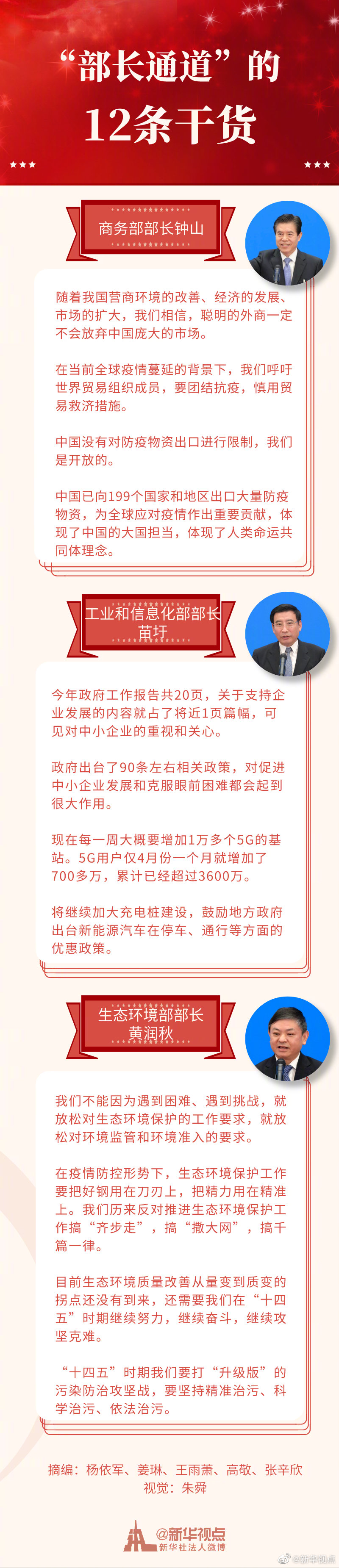原標(biāo)題:今天的“部長通道”,12條干貨! 5月25日,商務(wù)部部長鐘山、工業(yè)和信息化部部長苗圩、生態(tài)環(huán)境部部長黃潤秋亮相全國兩會“部長通道”。新華視點微博為你總結(jié)了12條干貨,請看↓