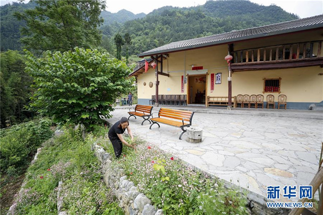 5月28日,重慶市巫溪縣紅池壩鎮(zhèn)龍臺村村民在打理自家屋前的小花園。新華社發(fā)(黃偉 攝)