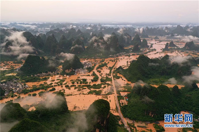 這是廣西陽朔縣部分出現(xiàn)嚴(yán)重積水的村莊(6月7日攝,無人機照片)。 新華社記者 陸波岸 攝