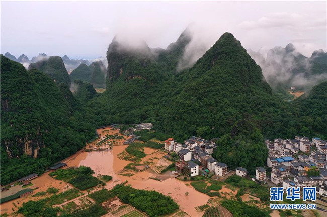 這是廣西陽朔縣部分出現(xiàn)嚴(yán)重積水的村莊(6月7日攝,無人機照片)。新華社記者 陸波岸 攝