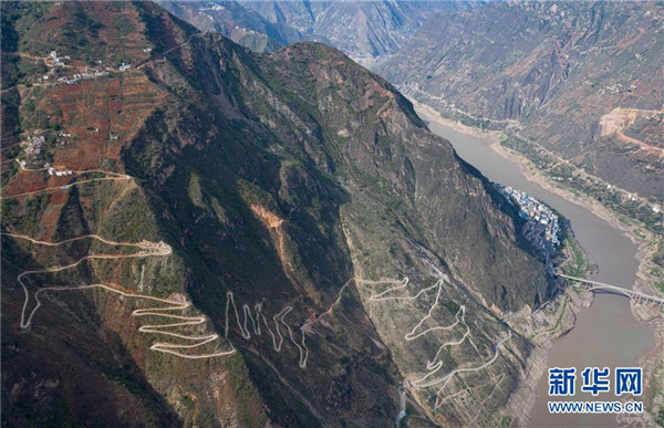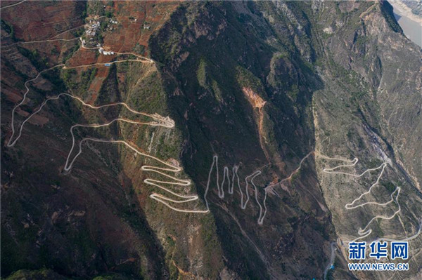 金陽縣蘆稿鎮(zhèn)大灣子村12公里左右的通村公路,28個(gè)彎蜿蜒盤旋在金沙江峽谷懸崖絕壁邊(6月7日攝,無人機(jī)照片)。坐落在金沙江畔的四川省金陽縣是國(guó)家級(jí)深度貧困縣,境內(nèi)群山連綿起伏,海拔落差大,眾多村寨處于高山或者高半山上,道路施工難度大。近年來,當(dāng)?shù)卣畬⒔煌ㄗ鳛槊撠毠?jiān)的先導(dǎo)性工程,路越修越寬、越修越好,成為當(dāng)?shù)厝罕姷拿撠氈赂宦?。截?019年底,金陽縣實(shí)現(xiàn)所有鄉(xiāng)鎮(zhèn)通油路、建制村通硬化路,鄉(xiāng)道里程達(dá)329.9公里,村道里程達(dá)866.8公里。新華社記者江宏景攝