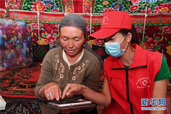 6月20日,新疆阿勒泰地區(qū)布爾津縣也格孜托別鄉(xiāng)克孜勒托蓋村村醫(yī)來到布爾津縣黑流灘草原給牧民巴合提古麗·塔拉甫汗檢查身體。圍繞實現(xiàn)人人享有基本醫(yī)療衛(wèi)生服務目標,2016年起,新疆布爾津縣開展家庭醫(yī)生簽約服務工作。該縣組建家庭醫(yī)生簽約團隊65個,團隊醫(yī)務人員233名,通過手機APP、基本公衛(wèi)系統(tǒng)與全縣建檔立卡貧困戶進行電子化簽約,提升村醫(yī)隨訪的工作效率和質量。截至目前,已完成簽約42936人,履約40043人。新華社記者沙達提攝