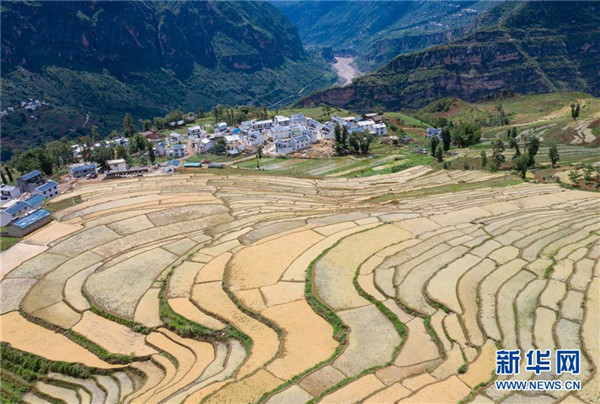 6月24日,金沙江邊的四川省布拖縣拉果鄉(xiāng)偉木村安全住房依山而建錯(cuò)落有致(無人機(jī)照片)。新華社記者江宏景攝