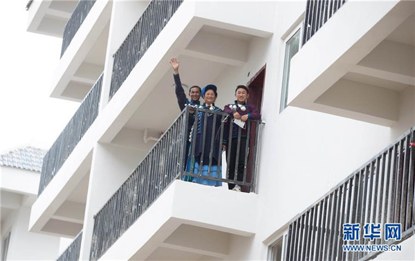 6月21日,在四川省布拖縣縣城易地扶貧搬遷集中安置點(diǎn)(依撒社區(qū)),來自特木里鎮(zhèn)乃烏村的社也小黑一家在新居招手。新華社記者江宏景攝