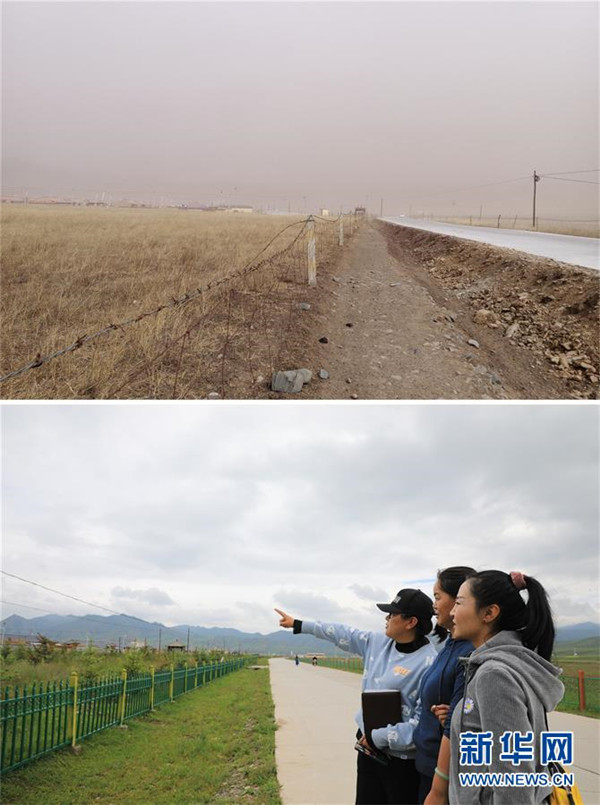 拼版照片:上圖為崗岔村村道綠化改造前的面貌(資料照片)。下圖為7月23日,卓瑪吉(右一)和駐村幫扶工作隊隊員站在綠化改造后的崗岔村村道上,謀劃下一步的工作。新華社發(fā)(杜哲宇攝)崗岔村是甘肅省甘南藏族自治州夏河縣??奇?zhèn)的一個牧業(yè)村,平均海拔3000米以上。2018年,在夏河縣文明辦工作的卓瑪吉開始擔(dān)任駐村幫扶工作隊隊長,每年都有200多天待在草原上。兩年來,卓瑪吉帶領(lǐng)大家開辦扶貧車間,發(fā)展特色產(chǎn)業(yè),聯(lián)系勞務(wù)輸出。為了讓村民更全面地了解精準(zhǔn)扶貧政策,卓瑪吉登門宣講政策。為了提高村容村貌,卓瑪吉發(fā)動大家開展廁所革命和庭院環(huán)境評比,積極響應(yīng)甘南藏族自治州“全域無垃圾”創(chuàng)建行動。她還從縣城請來醫(yī)生,為村民舉辦健康講座,在全村婦女中開展“兩癌篩查”。如今,崗岔村變成了干凈、整齊、富裕、美麗的生態(tài)文明村,提前實現(xiàn)了整村脫貧。談起心愿,卓瑪吉說:“要讓草原和草原上的人都變得更美。”新華社發(fā)