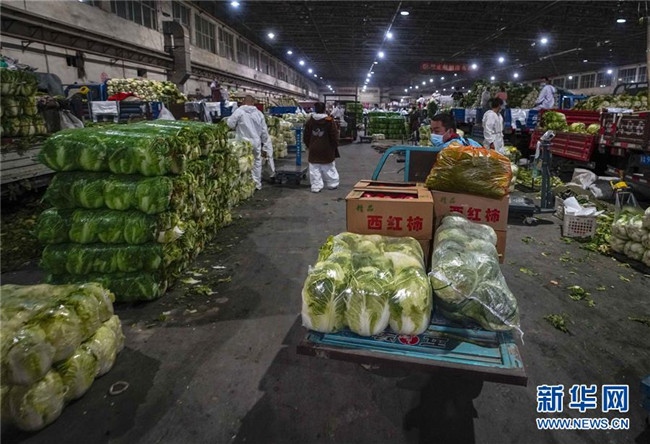 在新疆九鼎農(nóng)產(chǎn)品批發(fā)交易市場里,陳金奇(左)采購?fù)尥薏耍?月8日攝)。新華社記者 趙戈 攝