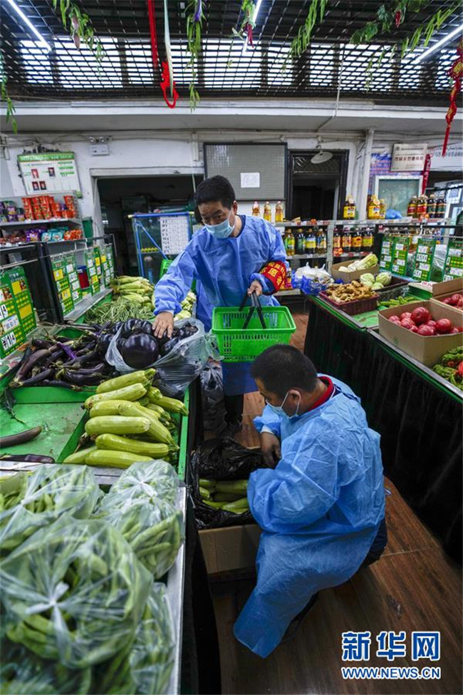 在烏魯木齊市沙依巴克區(qū)揚(yáng)子江街道青松苑社區(qū)蔬菜直銷點,陳金奇(前)幫助為小區(qū)居民采買的志愿者按照網(wǎng)絡(luò)訂單挑選蔬菜(8月8日攝)。新華社記者 趙戈 攝