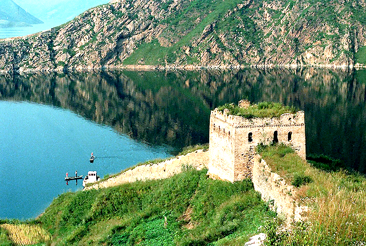 潘家口水庫“水下長城”,一船只從城墻邊駛過(攝于2012年)。新華社發(fā)(朱建軍 攝)