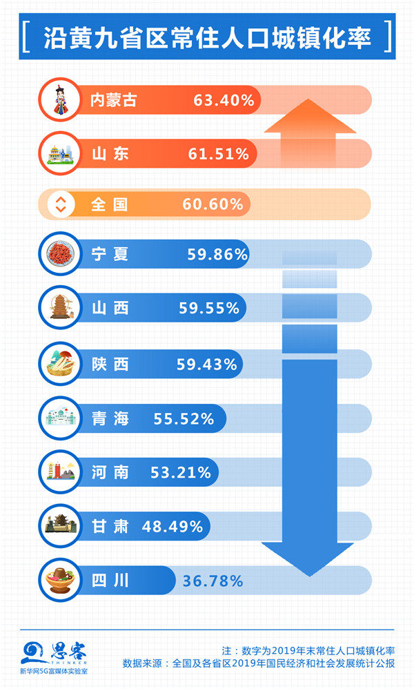 鄭州、西安、濟(jì)南等中心城市和中原等城市群帶動(dòng)區(qū)域內(nèi)城市及城市群加快建設(shè),但目前九省區(qū)城鎮(zhèn)化水平及中心城市輻射帶動(dòng)能力仍有待提升。沿黃九省區(qū)僅有內(nèi)蒙古和山東的常住人口城鎮(zhèn)化率高于全國平均水平。從中心城市看,流域內(nèi)鄭州和西安的地區(qū)生產(chǎn)總值在九大國家中心城市中處在相對較后的位置。西寧、蘭州、銀川等首位度相對較高的省會城市輻射帶動(dòng)能力也有限。