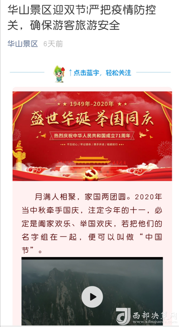 9月30日至10月8日期間,景區(qū)官方微信以歡度雙節(jié)、防疫安全、熱心服務(wù)、旅游攻略等為主題發(fā)布宣傳軟文23篇,累計閱讀量4.2萬人次,分享及轉(zhuǎn)發(fā)量共計1430次;官方微博向游客及時發(fā)布景區(qū)天氣、客流、景色實況、溫馨提示等景區(qū)度節(jié)綜合信息共計102條,閱讀量高達101.9萬次,并耐心、細致解答網(wǎng)友私信、評論共計532條;通過抖音平臺發(fā)布景區(qū)公告、秋日美景、好人好事等短視頻及圖片錦集共計18條,播放量共計 1.4萬次。