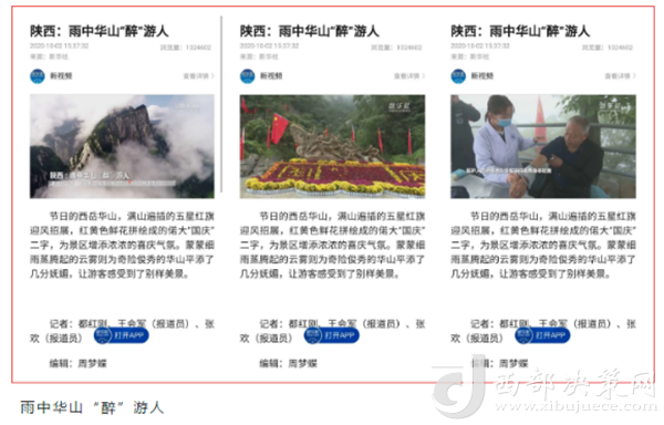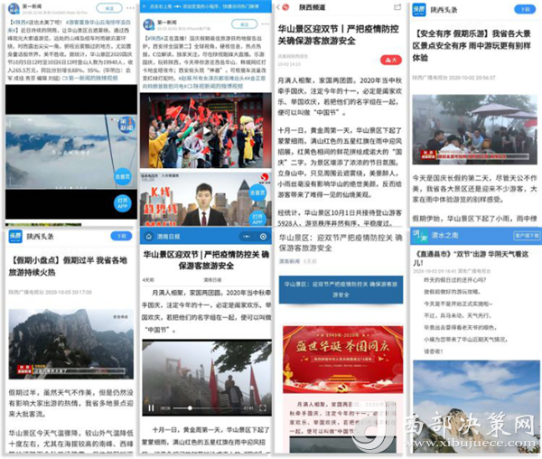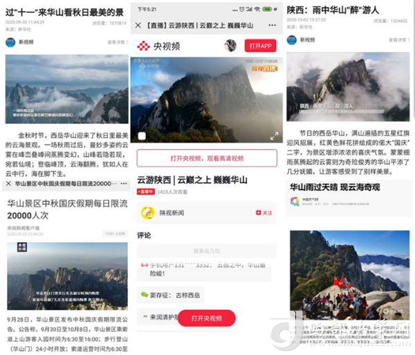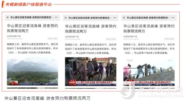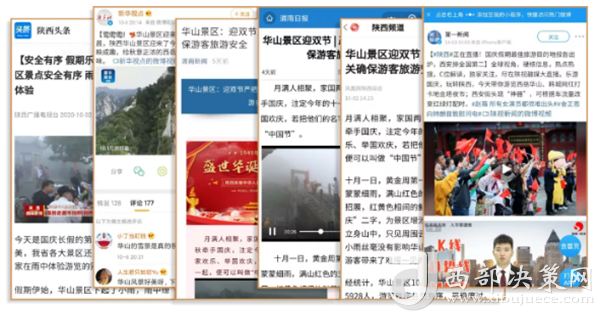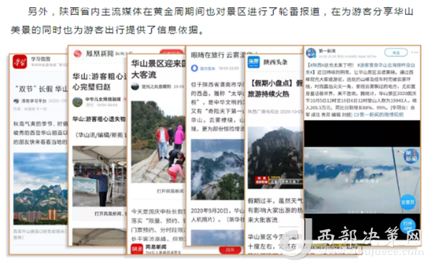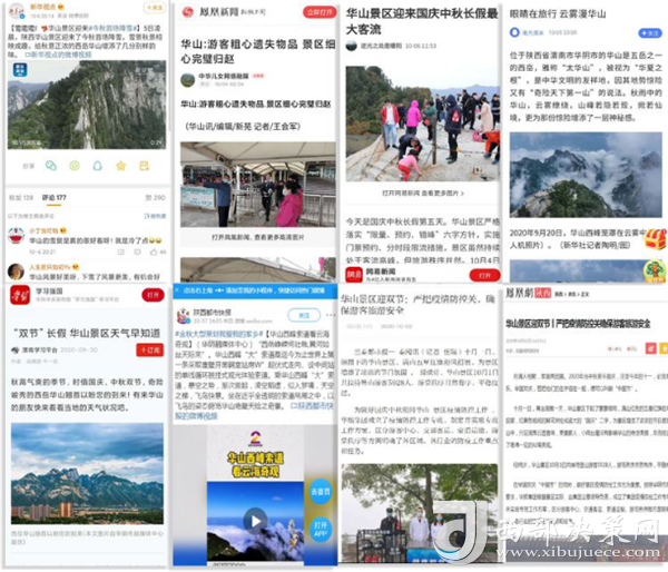 度節(jié)期間,通過央視cctv2【天下財經(jīng)】、cctv4、cctv13【新聞30分】、cctv13【新聞直播間】、央視網(wǎng)【國慶假期·出游】、央視網(wǎng)學習強國、央視新聞客戶端、新華社等國家級媒體對景區(qū)度節(jié)工作、游覽秩序、特色服務(wù)等方面進行轟炸式報道;聯(lián)合陜西日報、陜西電視臺、渭南日報、渭南電視臺、三秦都市報、陜西旅游資訊、騰訊網(wǎng)、新浪網(wǎng)、網(wǎng)易陜西、鳳凰陜西等30余家主流媒體對景區(qū)度節(jié)期間各項工作及實時風景進行跟蹤報道,共計發(fā)布各類宣傳稿件239篇,全面提升景區(qū)旅游熱度。