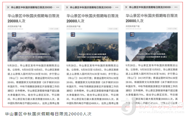 節(jié)日期間,共進行網(wǎng)絡(luò)輿情監(jiān)測200余次,篩查華山相關(guān)關(guān)鍵詞信息萬余條,及時甄別正負面信息。監(jiān)測到正面信息114條,轉(zhuǎn)載報道80余篇,內(nèi)容以華山風景、景區(qū)度節(jié)保障工作及防疫措施為主。監(jiān)測到華山相關(guān)不良信息2次,第一時間發(fā)現(xiàn)、匯報,重點進行跟蹤監(jiān)控,并對帖子中反映的訴求和突出問題,進行積極應(yīng)對和正面引導,將不利因素消除在萌芽狀態(tài),實現(xiàn)景區(qū)無一列負面報道的目標。