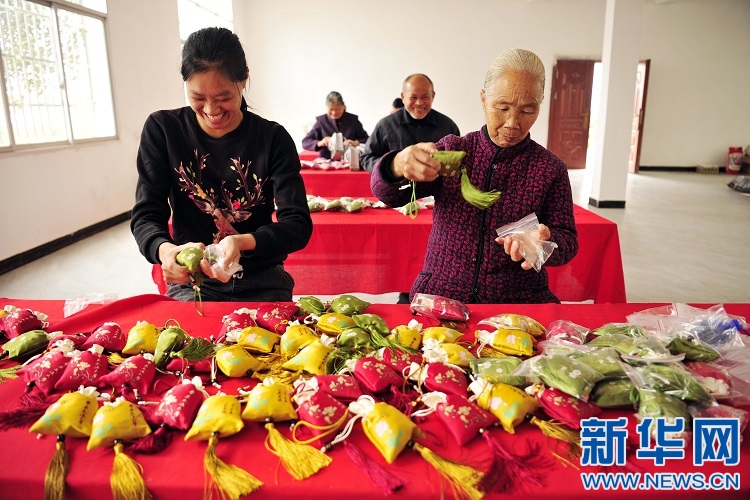 10月19日,在黃茅鎮(zhèn)軍屯村扶貧車(chē)間,村民在制作迷迭香袋。新華網(wǎng)發(fā) 鄧龍華 攝